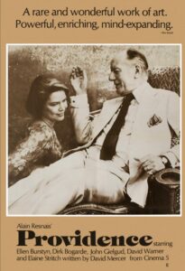 「プロビデンス」は、老齢の作家クライヴが、自らの死を目前にして幻想と現実が入り混じる中で、複雑な家族関係や人生を振り返る物語である。彼は病床で執筆する小説の登場人物に家族を投影し、苦悩や愛憎を絡めた物語を紡いでいく。彼の幻想的なビジョンには、戦争、裏切り、愛が交錯し、現実の家族との関係にも深い影響を与えている。夢と現実、創作と現実の境界が曖昧になりながら、人生の終わりを前にした人間の内面が描かれている。